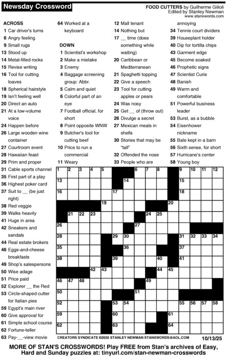 Because free access to the content of Newsday.com is available only to Newsday subscribers and customers of Cablevision (Newsday’s owner), many thousands of puzzle fans, spanning six continents, get the Newsday Crossword free every day right here at Stan’s Crossword Land.